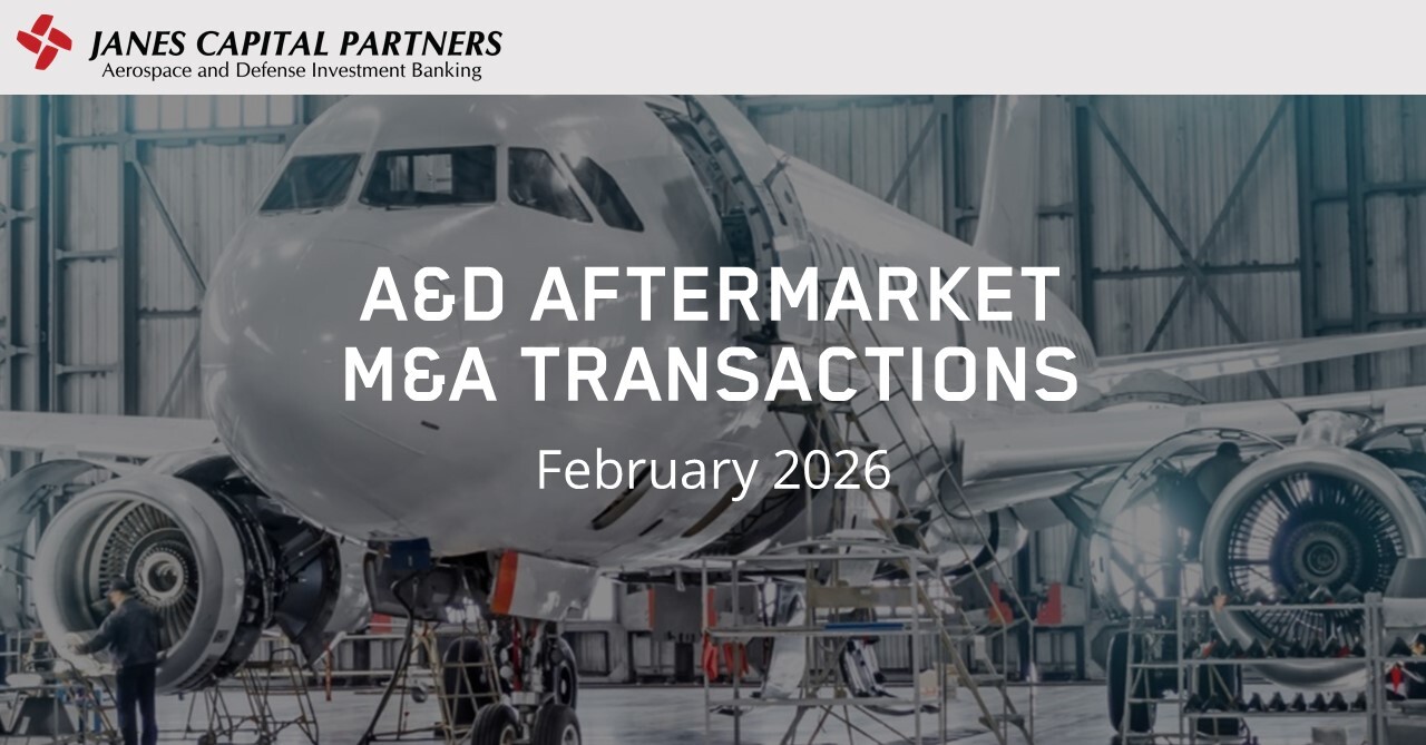 Download and read the February 2026 issue of the A&D Aftermarket Monthly, covering the latest M&A deal activity and valuation trends in the aerospace & defense manufacturing sector, including companies providing maintenance, repair & overhaul (MRO) services, parts manufacturer approval (PMA) and replacement parts, distribution and logistics, supplemental type certificate (STC) and modifications, supply chain management and aftermarket services. Sign up for the A&D Aftermarket Monthly distribution list to stay up-to-date on the headline acquisitions impacting your market and the current dynamics of the publicly traded strategic companies within the industry.